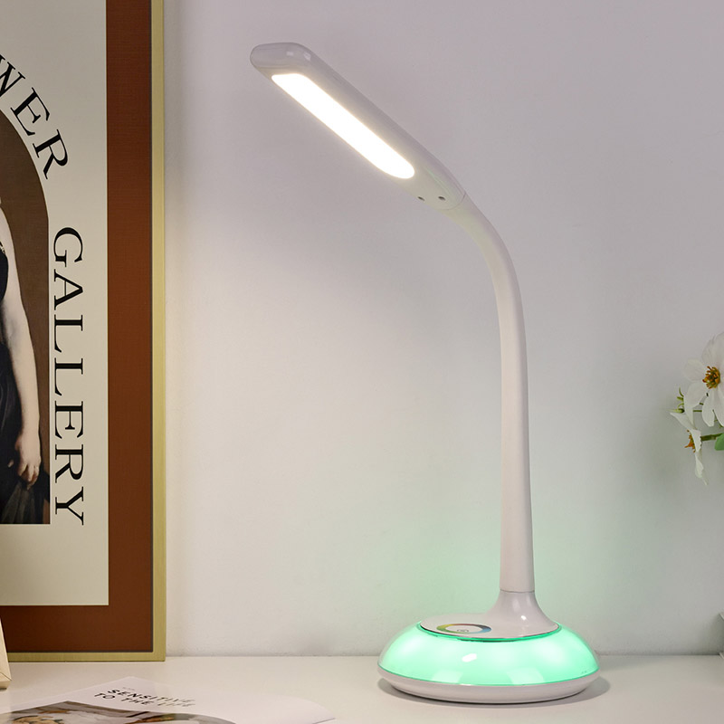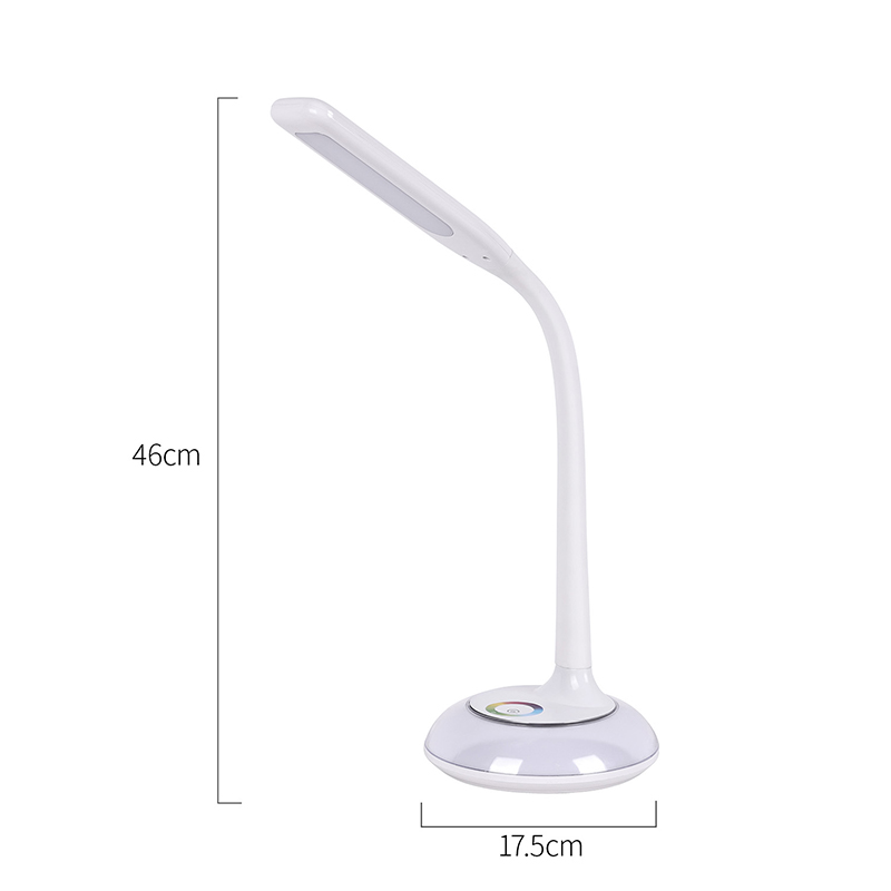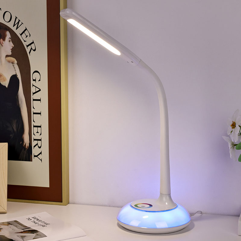 நவீன மேசை விளக்கு வடிவமைப்பு முக்கியமாக பிளாஸ்டிக்கால் ஆனது, மடிக்கக்கூடிய விளக்கு உடல் மற்றும் மேல்புறத்தில் ஒரு LED விளக்கு தலை வெட்டப்பட்டது. மூன்று வகையான விளக்குகளை மாற்றலாம்: சூடான, இயற்கை மற்றும் குளிர். பல்வேறு வாசிப்பு மற்றும் பணிச்சூழலுக்கு ஏற்ப ஒவ்வொரு வண்ணத்திற்கும் இடையில் மூன்று தீவிரங்கள் சரிசெய்யப்படுகின்றன. கீழே, ஆறு RGB வண்ணங்களை மாற்றலாம், அவை கண்களுக்கு மகிழ்ச்சியாகவும், படிக்கும் மற்றும் வேலை செய்யும் சக ஊழியர்களுக்கு நிதானமாகவும் இருக்கும்.