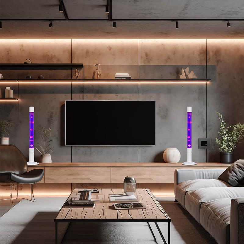 இந்த விளக்கின் உண்மையான இதயம் அதன் மைய அம்சத்தில் உள்ளது: மயக்கும் ஊதா நிற திரவத்தால் நிரப்பப்பட்ட நீண்ட, வெளிப்படையான கண்ணாடிக் குழாய். இந்த திரவம், அந்தி வேளையில் ஒரு அமைதியான தடாகத்தை நினைவூட்டுகிறது, ஒளியின் கீழ் பளபளப்பானது, அமைதியான மற்றும் புதிரான சூழ்நிலையை உருவாக்குகிறது. இந்த குழாயின் உள்ளே, இளஞ்சிவப்பு மற்றும் ஊதா நிற பந்துகளின் வரிசை அழகாக மிதக்கிறது, அவற்றின் மென்மையான இயக்கங்கள் பார்வையாளர்களை கவர்ந்திழுக்கும் மற்றும் விளக்கின் நிலையான வடிவத்தில் ஒரு மாறும் உறுப்பைச் சேர்க்கிறது.