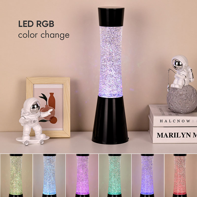 இந்த சிறிய இரவு ஒளியின் மற்றொரு சிறப்பம்சமானது அதன் திரவ மற்றும் பளபளப்பான வடிவமைப்பு ஆகும். திரவத்தில் அதிக அளவு மினுமினுப்பு உள்ளது, இது ஒளியின் வெளிச்சத்தின் கீழ் பிரகாசமாக பிரகாசிக்கிறது, இரவு வானத்தில் எண்ணற்ற நட்சத்திரங்கள் மின்னுவதைப் போல. திரவம் பாயும் போது, மினுமினுப்பு ஒழுங்கற்ற முறையில் சிதறி, கனவு போன்ற காட்சி விளைவை உருவாக்கும். 3AAA பேட்டரியுடன் லெட் கிளிட்டர் லாவா விளக்கு RGB வண்ண விளக்கு செயல்பாட்டையும் கொண்டுள்ளது. மேம்பட்ட LED தொழில்நுட்பத்தின் மூலம், லைட்டிங் சாதனங்கள் மென்மையான மற்றும் சீரான ஒளியை வெளியிடலாம், மேலும் வெவ்வேறு காட்சிகள் மற்றும் தேவைகளுக்கு ஏற்ப ஒளியின் நிறத்தை சுதந்திரமாக சரிசெய்யலாம். வண்ணமயமான காட்சி விருந்தை உருவாக்க, உங்களுக்குப் பிடித்த நிறத்தைத் தேர்வுசெய்யலாம் அல்லது லைட்டிங் சாதனங்கள் தானாகவே வண்ணங்களை மாற்றிக்கொள்ளலாம்.
