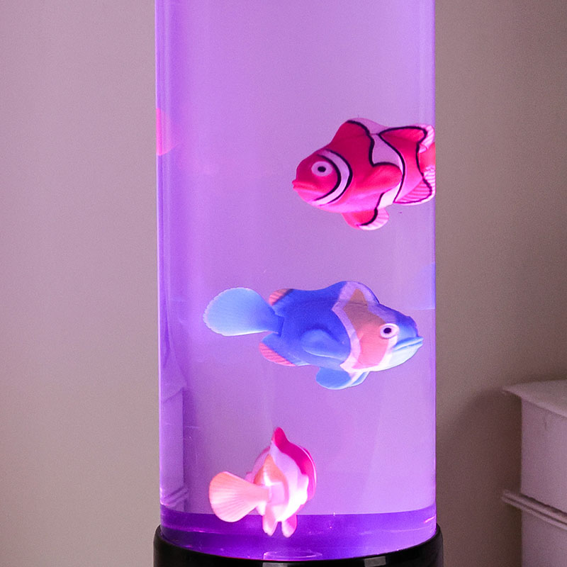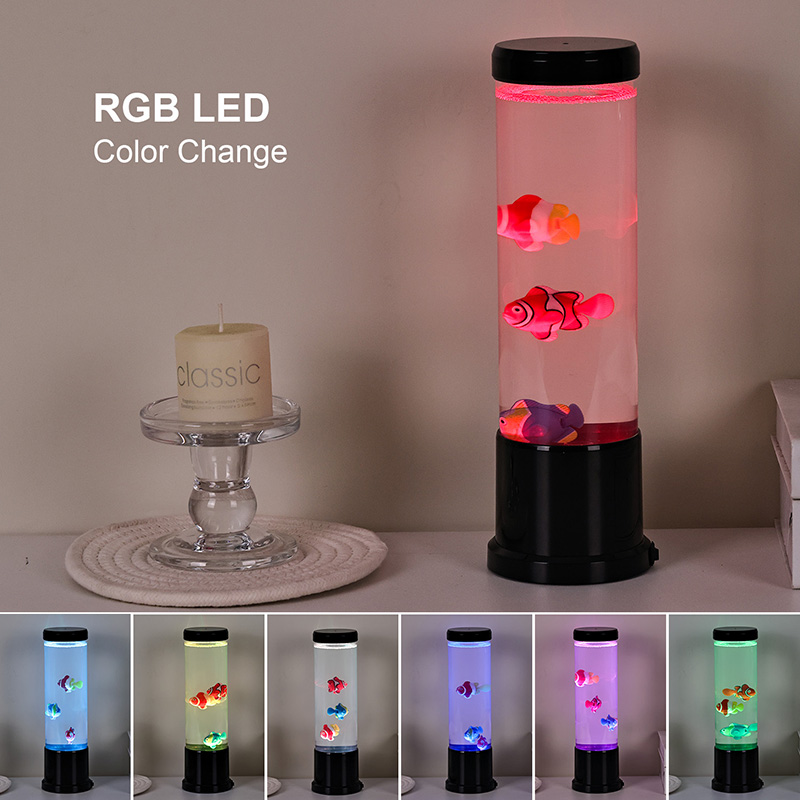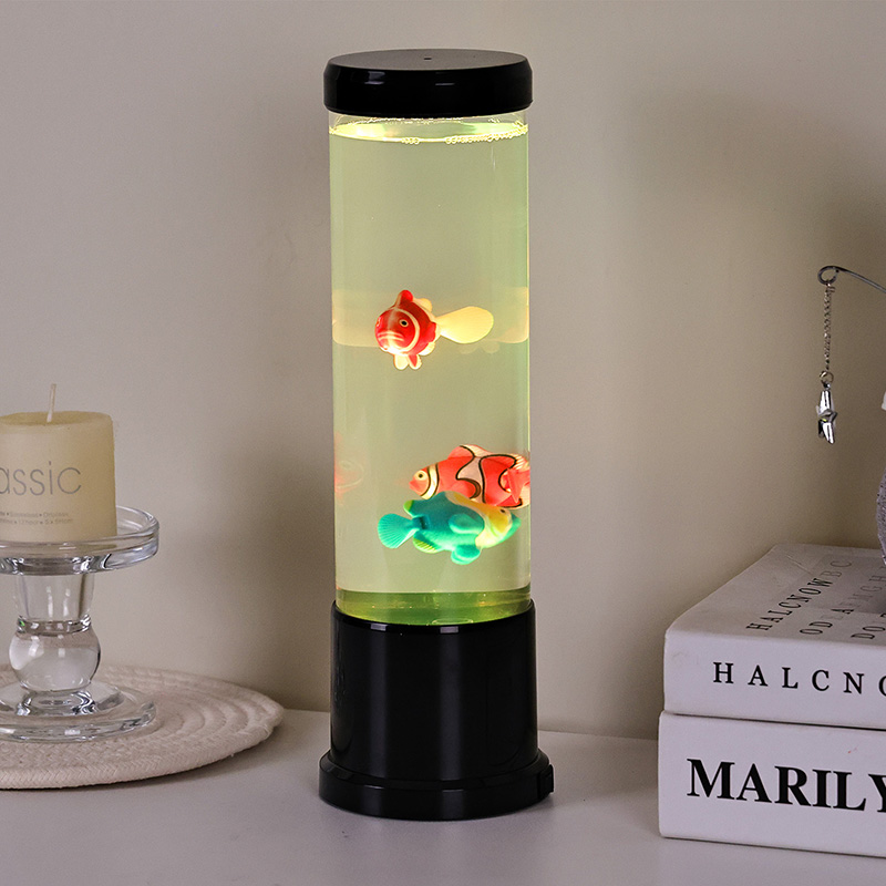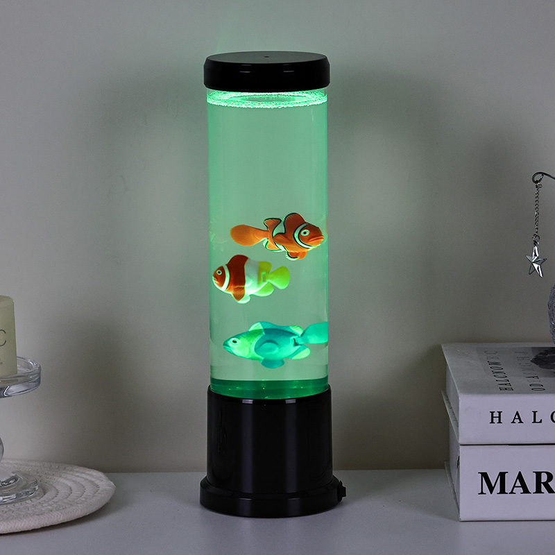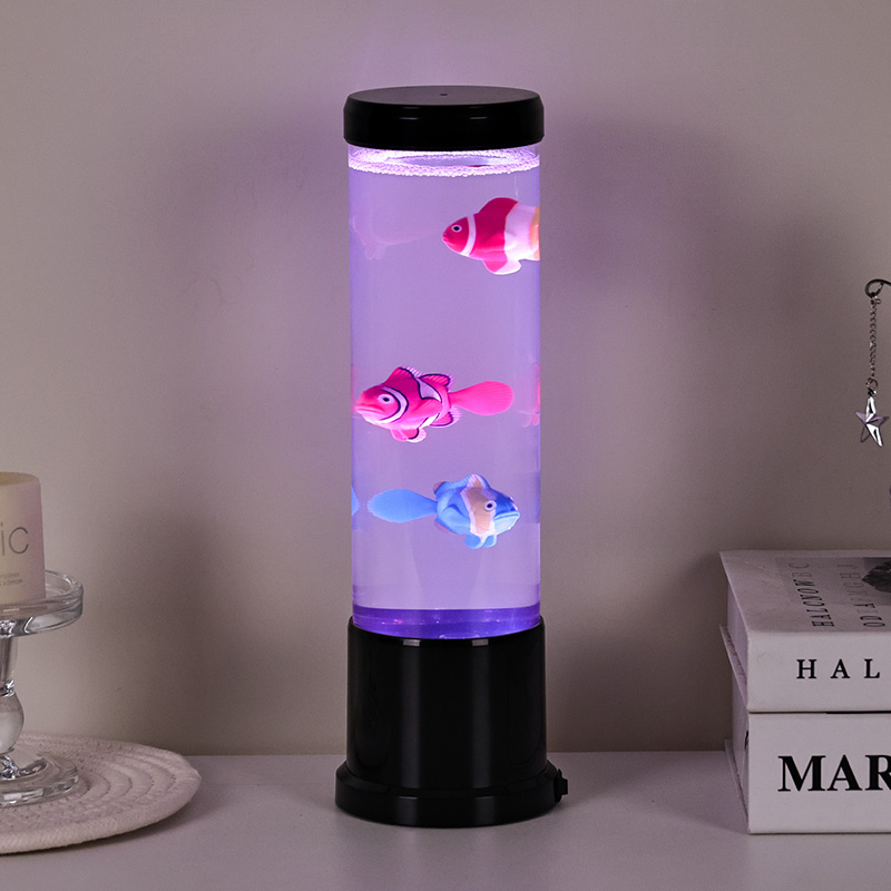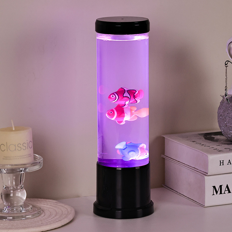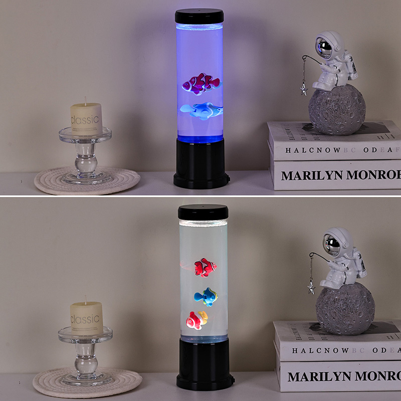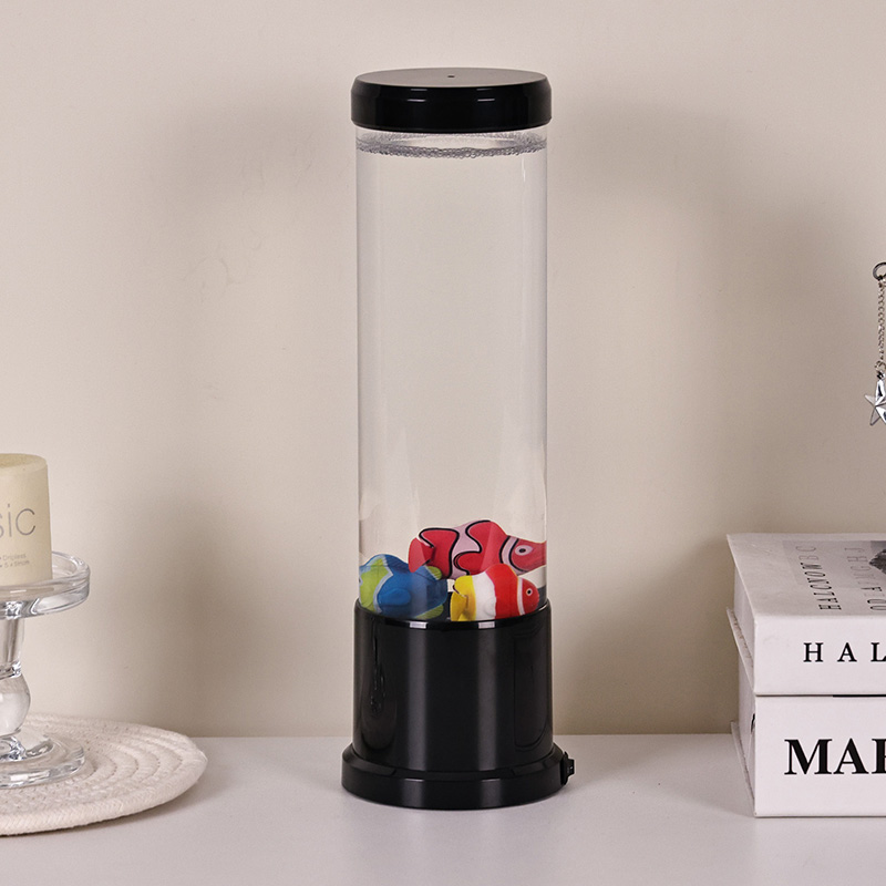 இந்த விளக்கின் மையத்தில் ஒரு உண்மையான மீன் தொட்டியின் கவனமாக வடிவமைக்கப்பட்ட உருவகப்படுத்துதல் உள்ளது. தெளிவான நெடுவரிசையின் உள்ளே, துடிப்பான கோமாளி மீன்கள் மற்றும் பிற வெப்பமண்டல இனங்கள் போன்ற அழகான விரிவான, மிதக்கும் மீன் உருவங்களை நீங்கள் காணலாம், அவை மெதுவாக நகர்ந்து நீர் போன்ற திரவத்தின் வழியாக நீந்துகின்றன. ஒளிரும் ஜெல்லிமீன்களை சேர்ப்பது மாயாஜால நீருக்கடியில் மாயையை அதிகரிக்கிறது, மென்மையான ஒளியுடன் துடிக்கிறது. இயக்கம் மற்றும் வண்ணத்தின் கலவையானது கவனத்தை ஈர்க்கும் மற்றும் உங்கள் சுற்றுச்சூழலுக்கு அமைதியைக் கொண்டுவரும் ஒரு மாறும் காட்சியை உருவாக்குகிறது.