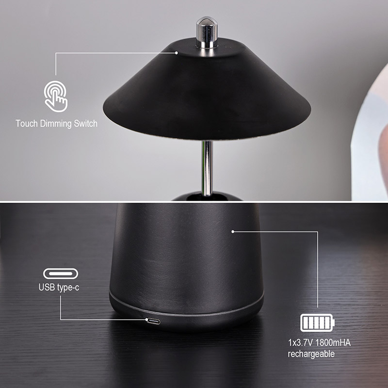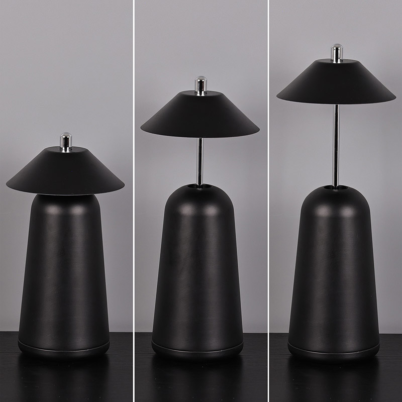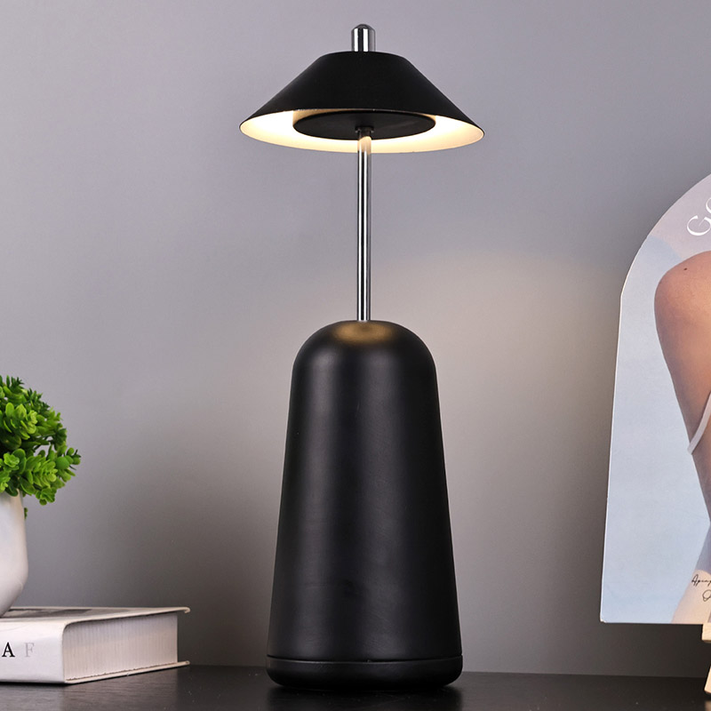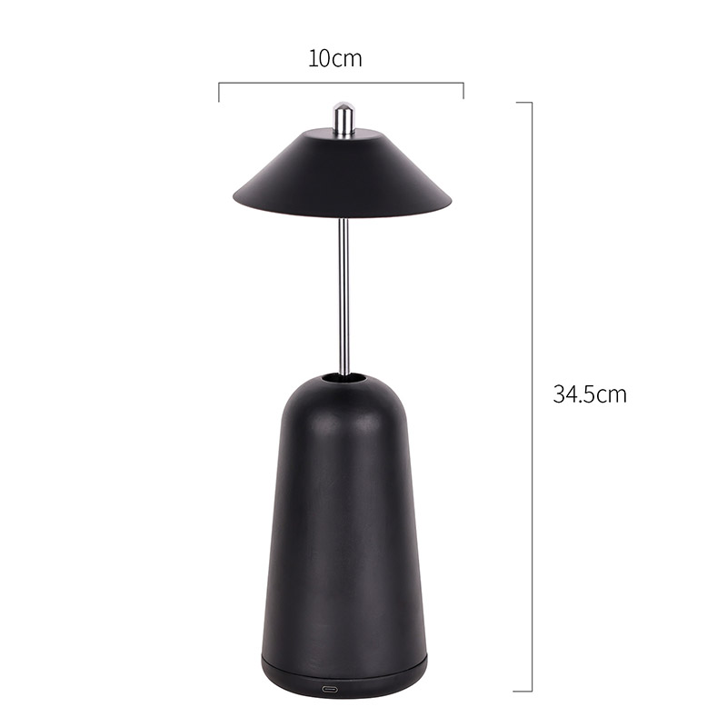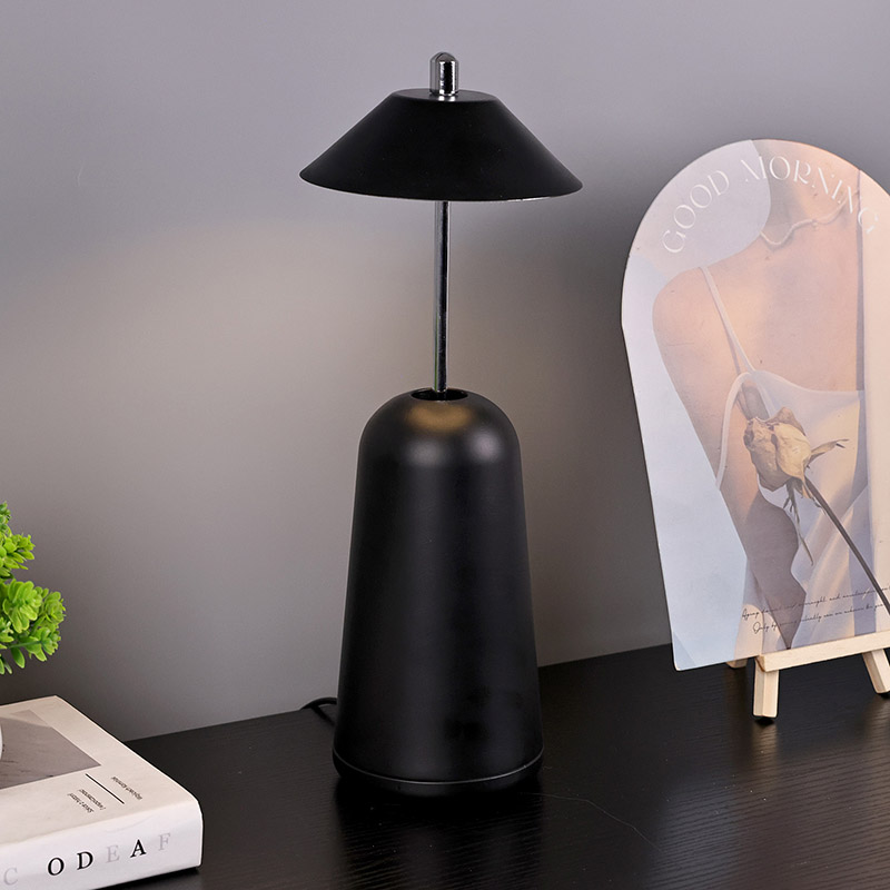அட்ஜஸ்ட் ஹைட் ஷேடுடன் கூடிய மாடர்ன் லெட் டெஸ்க் லேம்ப்பின் வெளிச்சம், சூடான வண்ணங்கள் மற்றும் 3000K முதல் 6500K வரையிலான ஒளித் தீவிரத்தின் மூன்று நிலைகளுடன், லேம்ப்ஷேடில் உட்புறமாக வெட்டப்பட்டுள்ளது. லாம்ப்ஷேட்டின் மேற்பகுதி ஆண்டெனாவைப் போன்ற தொடு சுவிட்ச் ஆகும். அடித்தளம் ஒழுங்கற்ற உருளை உலோகத்தால் ஆனது