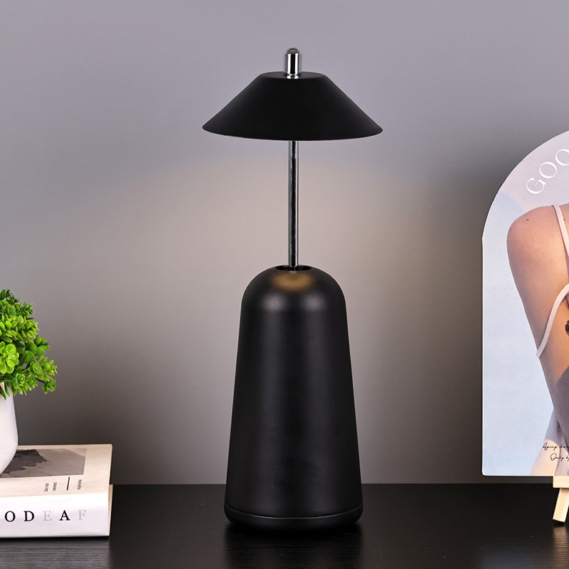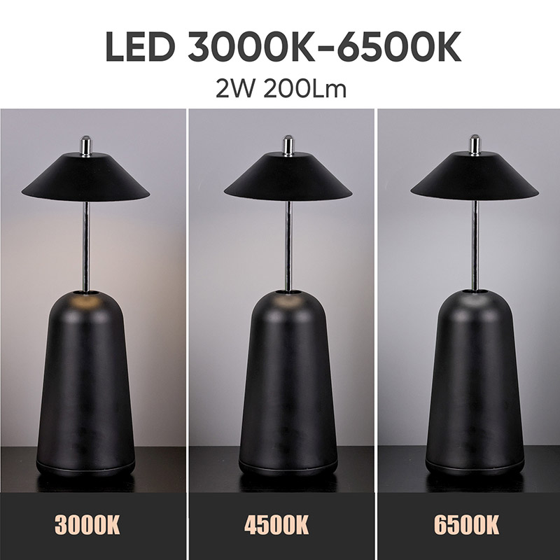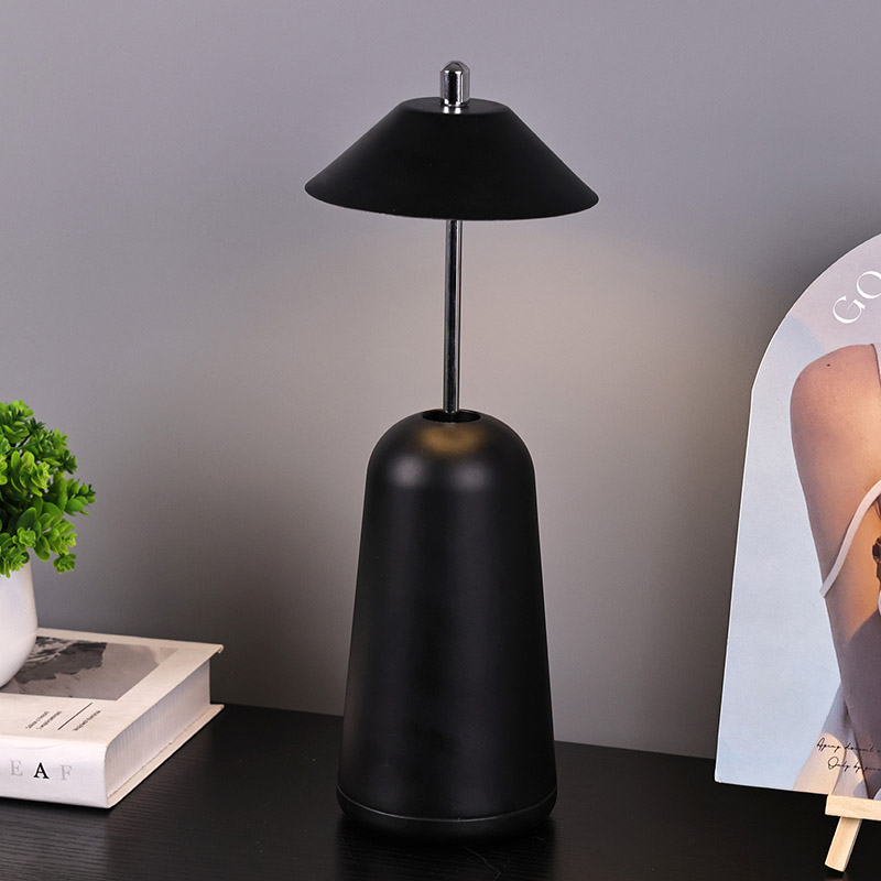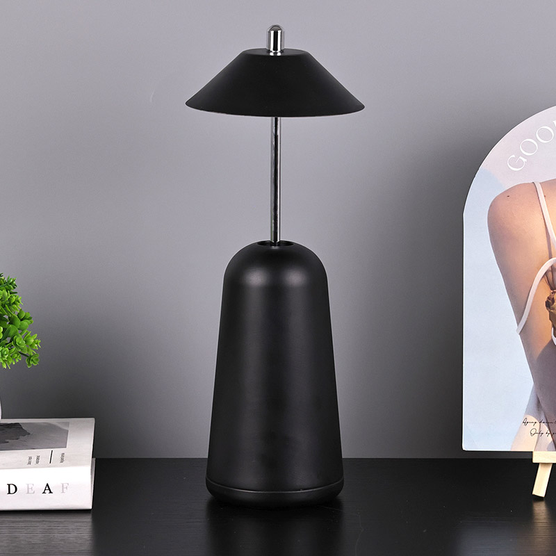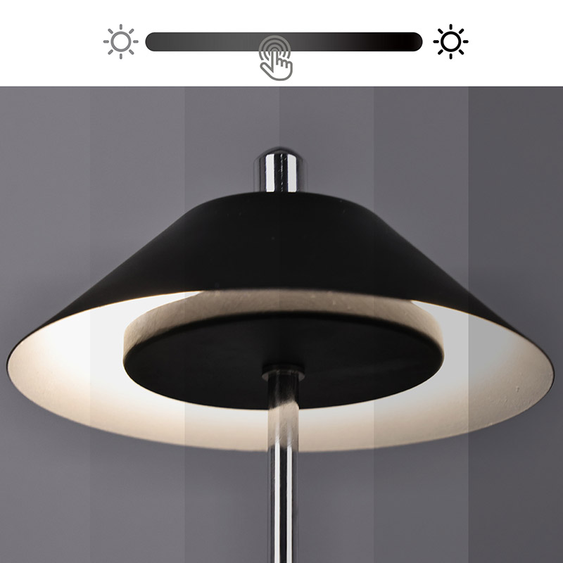 அட்ஜஸ்ட் ஹைட் ஷேடுடன் கூடிய மாடர்ன் லெட் டெஸ்க் லேம்ப்பின் வெளிச்சம், சூடான வண்ணங்கள் மற்றும் 3000K முதல் 6500K வரையிலான ஒளித் தீவிரத்தின் மூன்று நிலைகளுடன், லேம்ப்ஷேடில் உட்புறமாக வெட்டப்பட்டுள்ளது. லாம்ப்ஷேட்டின் மேற்பகுதி ஆண்டெனாவைப் போன்ற தொடு சுவிட்ச் ஆகும். அடித்தளம் ஒழுங்கற்ற உருளை உலோகத்தால் ஆனது