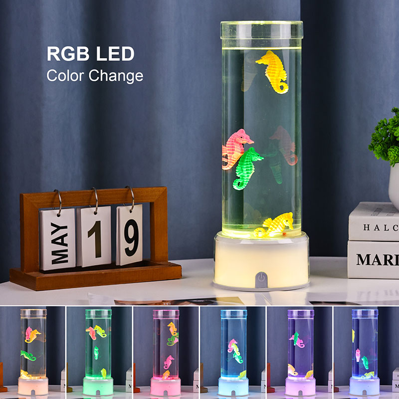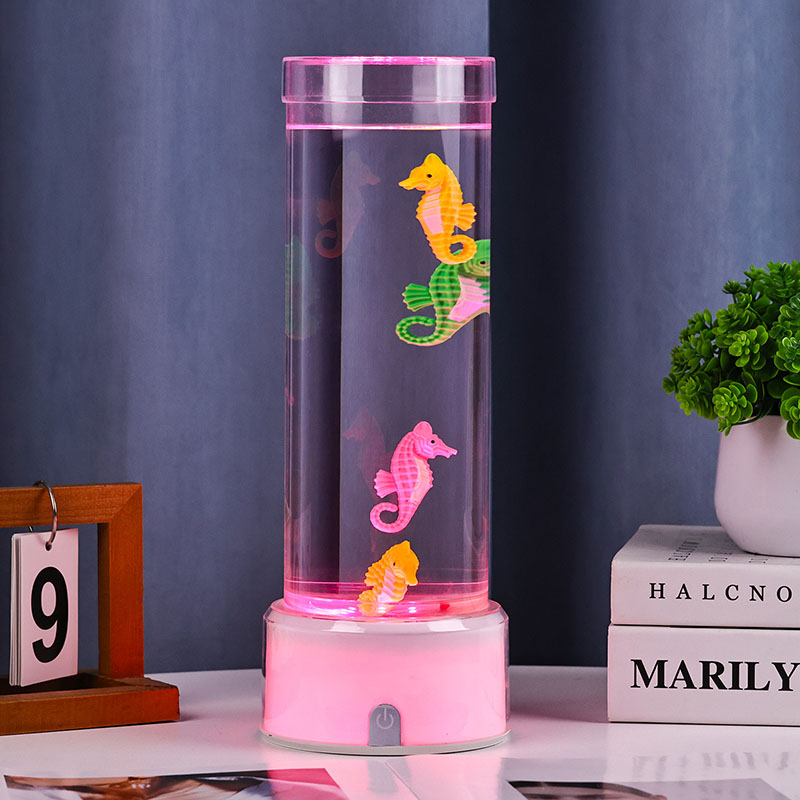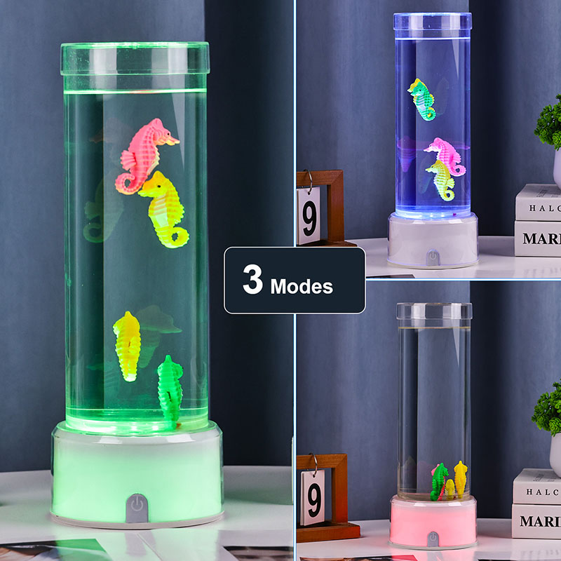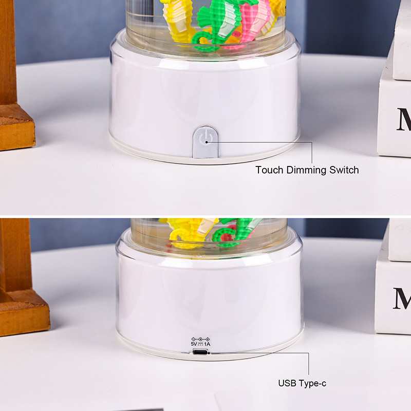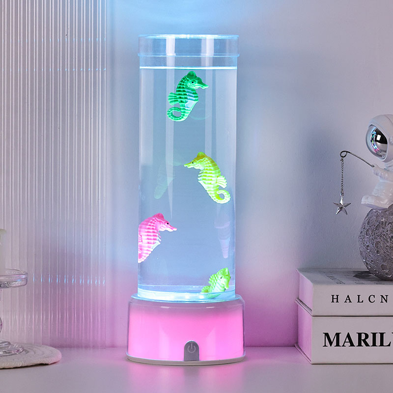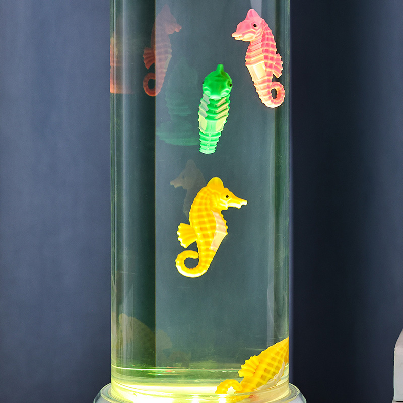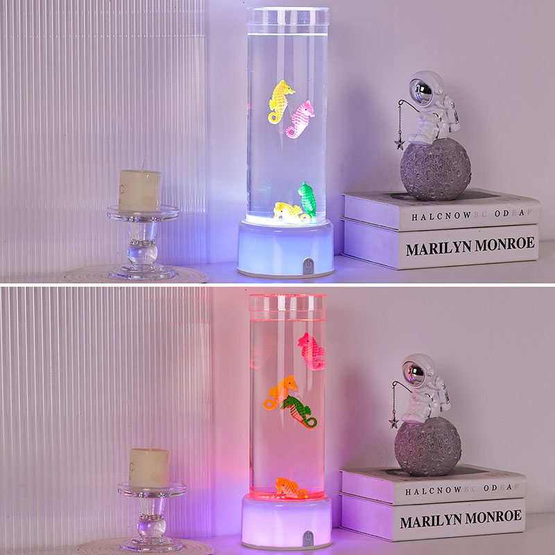 கடலின் அமைதியைத் தூண்டும் வசீகரிக்கும் நீருக்கடியில் காட்சி, பாதுகாப்பு நிலைத்தன்மை மற்றும் நீடித்த செயல்திறனை உறுதி செய்யும் உயர்தர நீடித்த பிளாஸ்டிக்கால் செய்யப்பட்ட இந்த விளக்கு, நச்சுத்தன்மையற்ற திரவம் மற்றும் வண்ணமயமான கடல் குதிரை ஆபரணங்களால் நிரப்பப்பட்ட நேர்த்தியான வெளிப்படையான குழாயுடன் தோராயமாக 12 அங்குல உயரத்தில் நிற்கிறது. ஒரு அமைதியான உள் சுழற்சி அமைப்பால் இயக்கப்படும் திரவ நெடுவரிசையில், நிஜ கடல் வாழ்க்கையைப் போன்ற இயற்கையான அசைவு இயக்கத்தை உருவாக்குகிறது, இந்த மென்மையான இயக்கம் பார்ப்பதற்கு இனிமையானது மற்றும் மன அழுத்தத்தைக் குறைக்க உதவுகிறது.