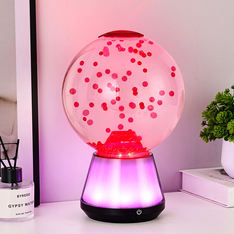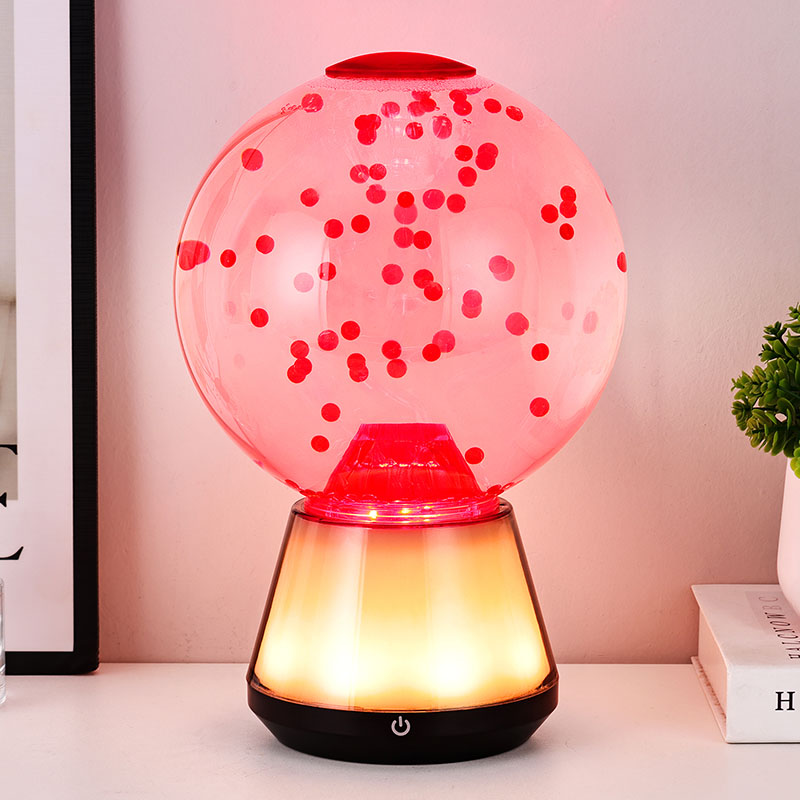 இந்த விளக்கு ஒரு மென்மையான பளபளப்பான பூச்சு கொண்ட ஒரு சுற்று பந்து வடிவ வடிவமைப்பைக் கொண்டுள்ளது, இது பூமியின் உள்ளே நூற்றுக்கணக்கான சிறிய சிவப்பு கோளங்கள் ஒரு அமைதியான சுழற்சி பம்ப் மூலம் இயக்கப்படும் தாள அலைகளில் மேல்நோக்கி மிதக்கின்றன. சிவப்பு ஆரஞ்சு மஞ்சள் நீல ஊதா மற்றும் பச்சை உட்பட எப்போதும் மாறும் காட்சி அனுபவத்தை வழங்குகிறது